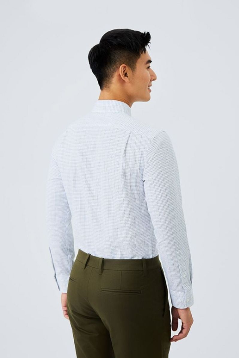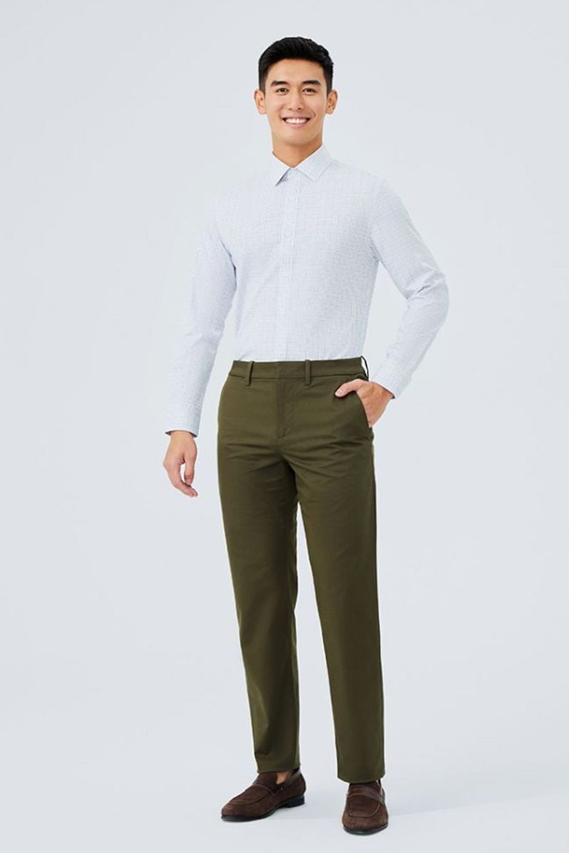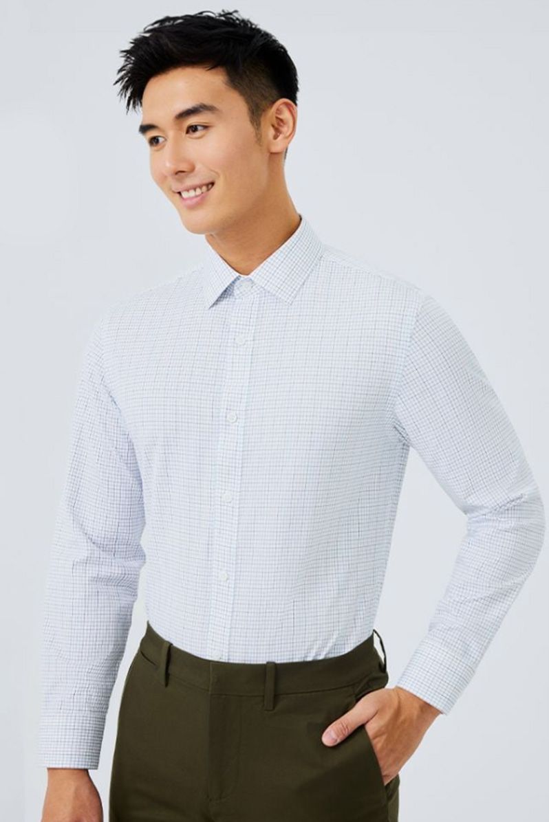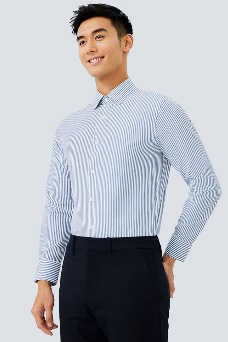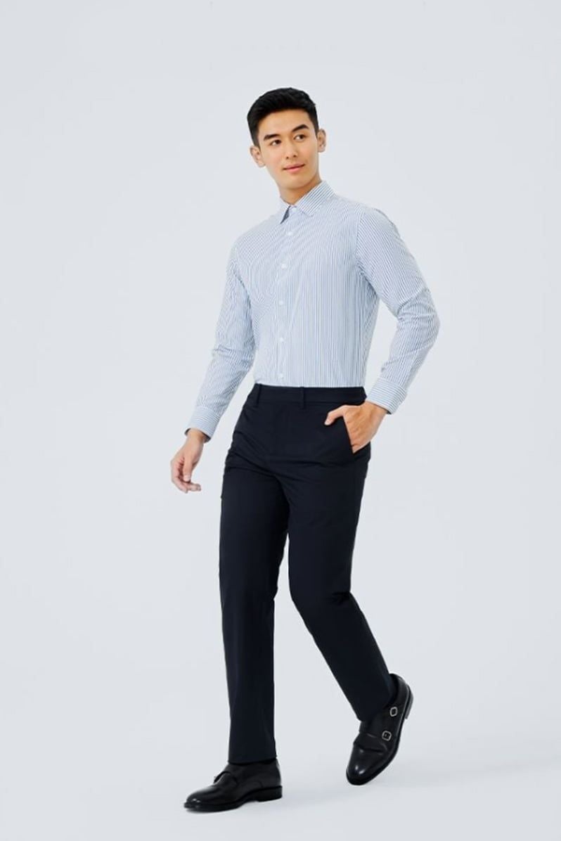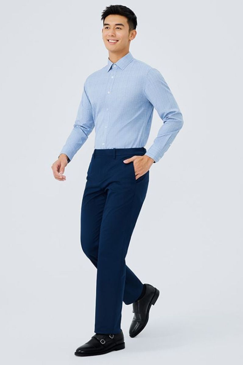 Phong cách công sở thanh lịch: Kết hợp Áo sơ mi nam Poplin Tay dài Chống nhăn 301-22 cùng quần tây tối màu và giày da Oxford, mang lại sự chuyên nghiệp, lịch lãm.