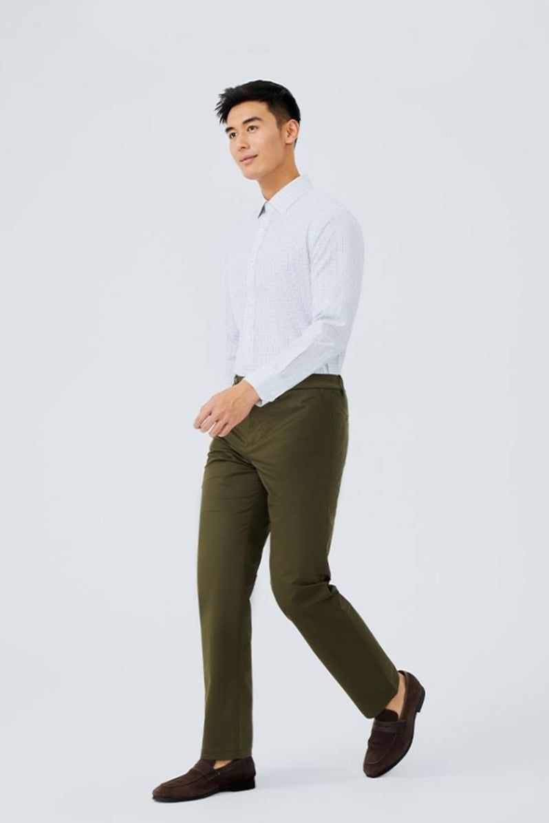 Phong cách smart-casual: Phối với quần chinos hoặc quần kaki sáng màu, giày lười da hoặc sneaker trắng, tạo sự trẻ trung nhưng vẫn tinh tế.